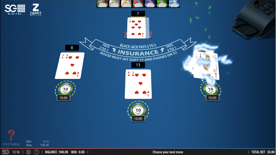 The Zappit Blackjack online free game features a unique experience without the addition of a size bet. Instead, the rules are slightly adjusted from the standard game to include the option to zap cards that add up to a total of 15 to 18. Choosing this option will provide a new set of cards, but on those hands your bet will be pushed if the dealer busts with a total of 22.