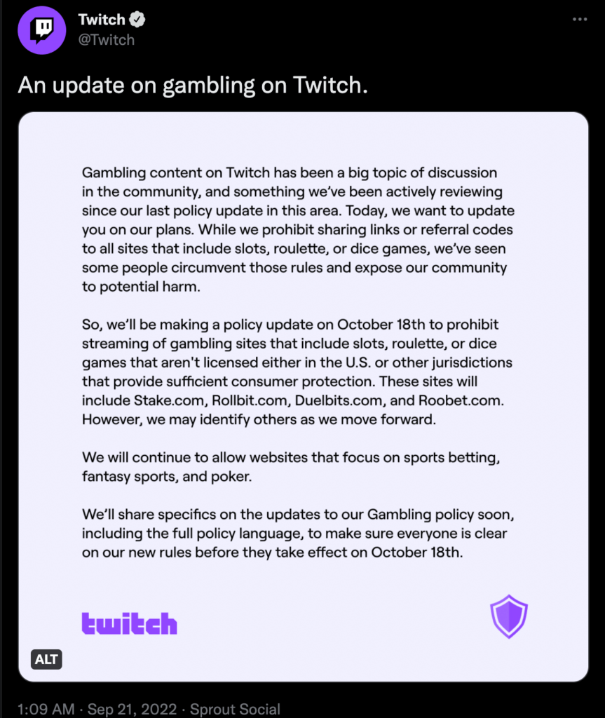 You may have heard a lot of news surrounding Twitch’s move to “ban” the streaming of gambling sites from October 18th. As usual, the details are lost on the masses…